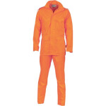 This Material does not comply with AUS /NZ HiVis Standard. Waterproof, two flap side pockets, foldaway hood. 3/4 Length Jacket & elastic side pants with leg press stud closure.