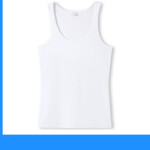 • Wide binding at neck and armholes, side seamed, shoulder to shoulder tape, double needle hems